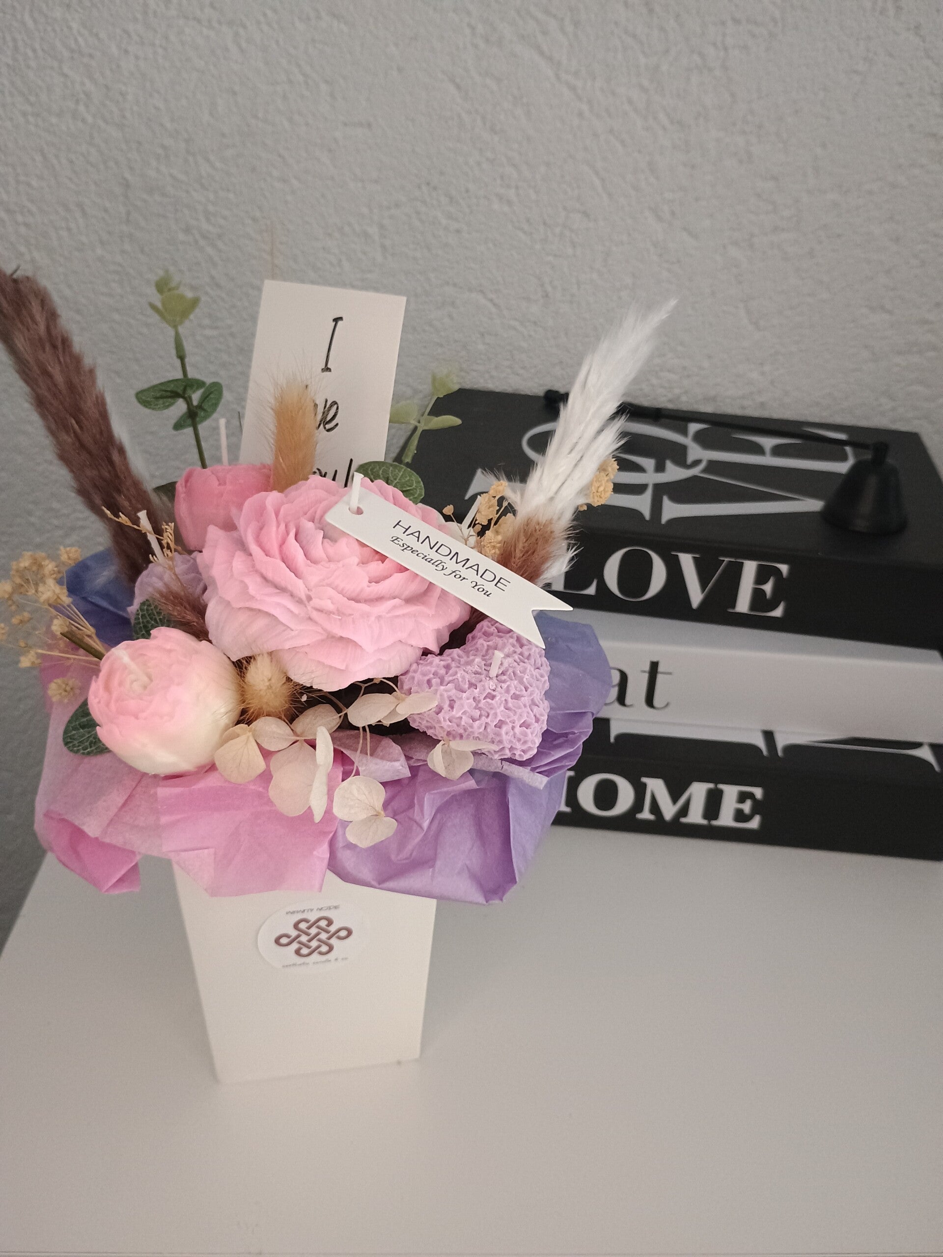 Die Box enthält ca. 7- 8 blütenförmige Kerzen mit einem wundervollen, natürlichen Blumenduft. Sie sind aus 100 % bio-zertifiziertem Sojawachs gefertigt.