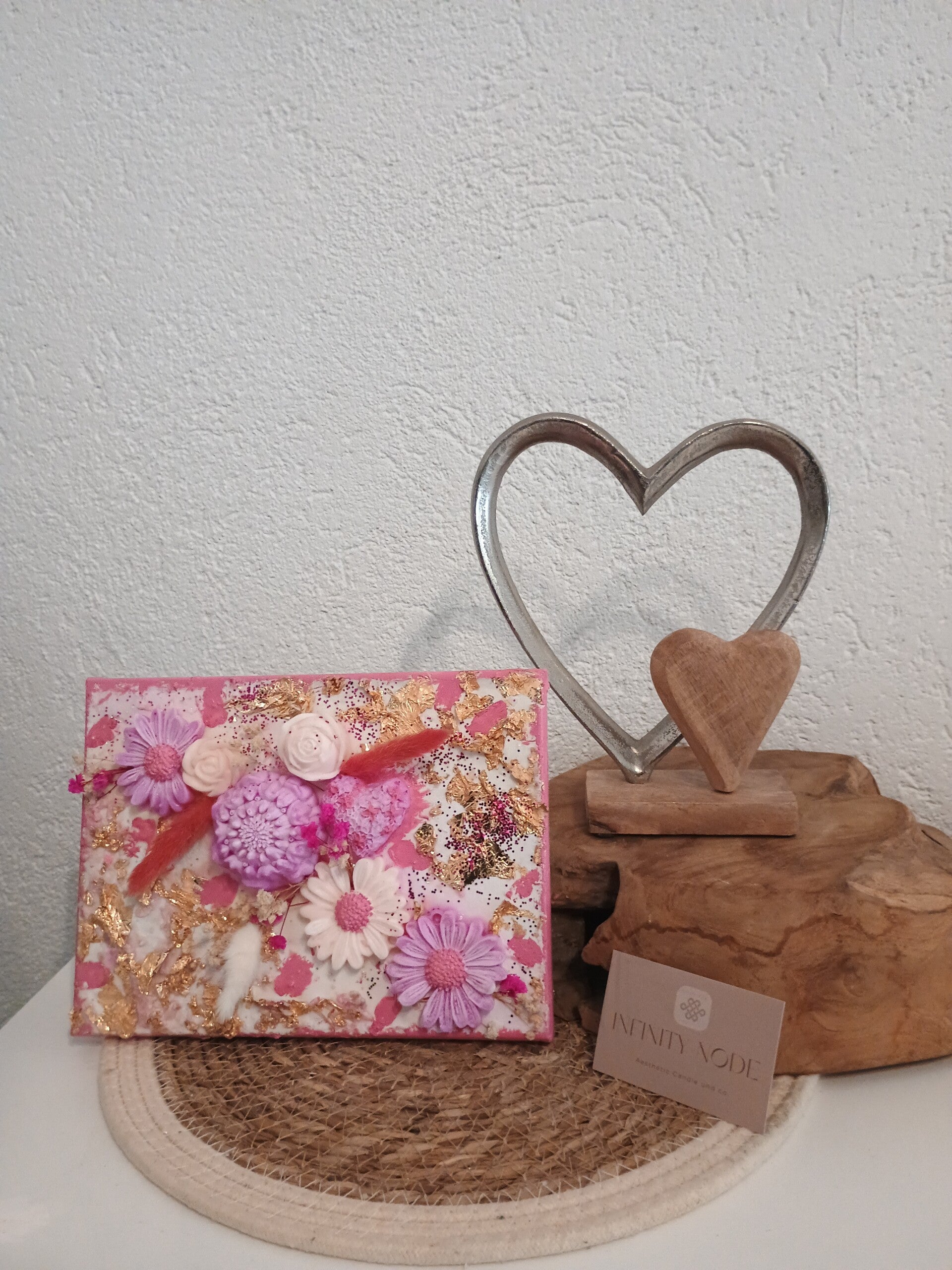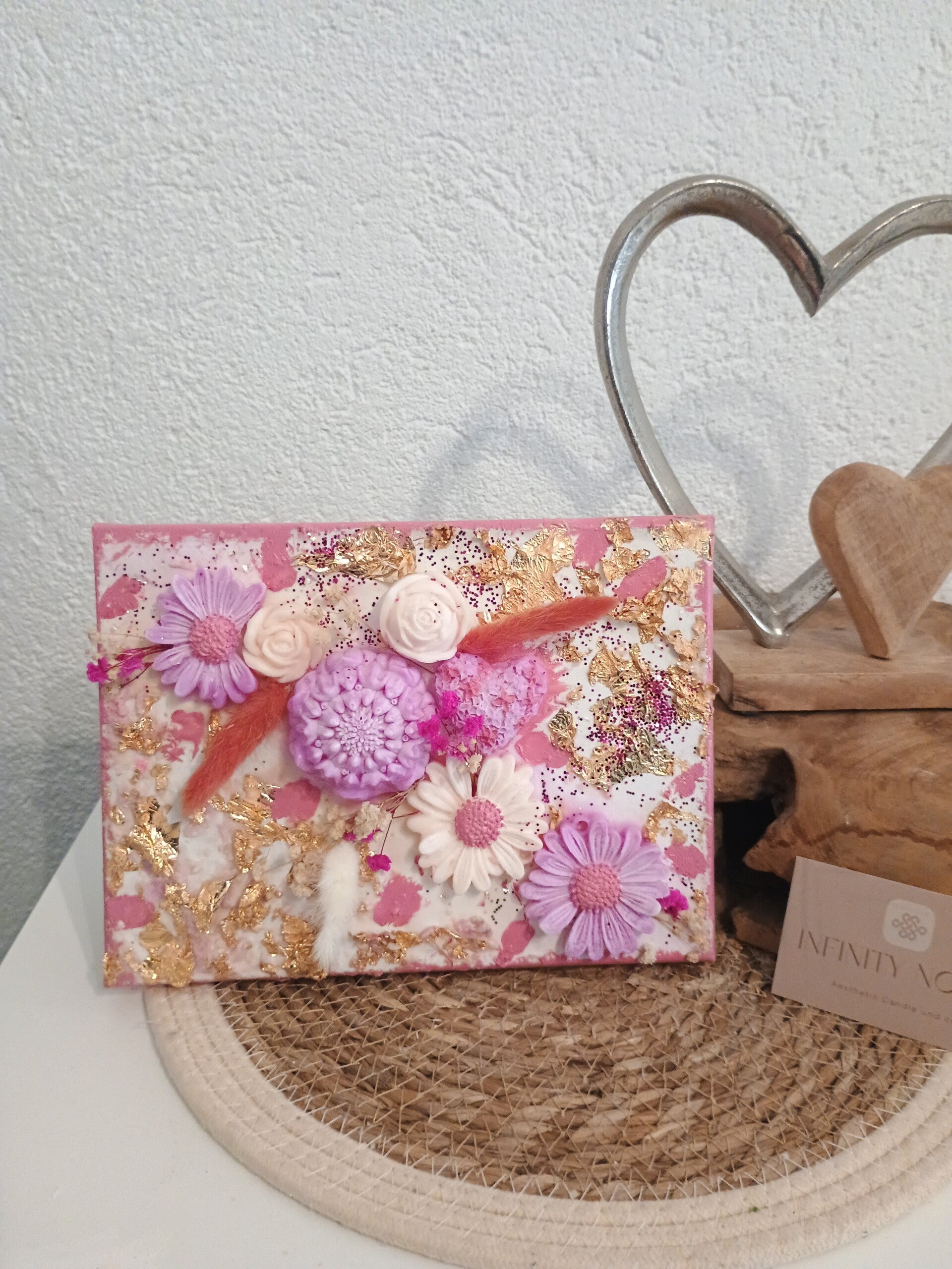 Diese handgefertigte Leinwand ist mit duftenden Blumen aus natürlichem Sojawachs beklebt und liebevoll mit Trockenblumen wie Pampasgras oder Eukalyptus, Schleierkraut  usw... dekoriert. Jedes Stück ist ein Unikat und bringt natürliche Eleganz und feinen Duft in dein Zuhause.