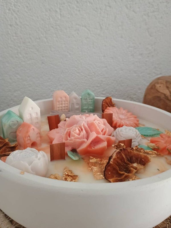 Dekoriert mit getrockneten Orangenschalen, kleinen Wachsblumen und zarten Herz-Akzenten, spiegelt diese Kerze die Farbwelt des Herbstes wider: sanftes Kupfer, cremiges Beige und warme Brauntöne.
