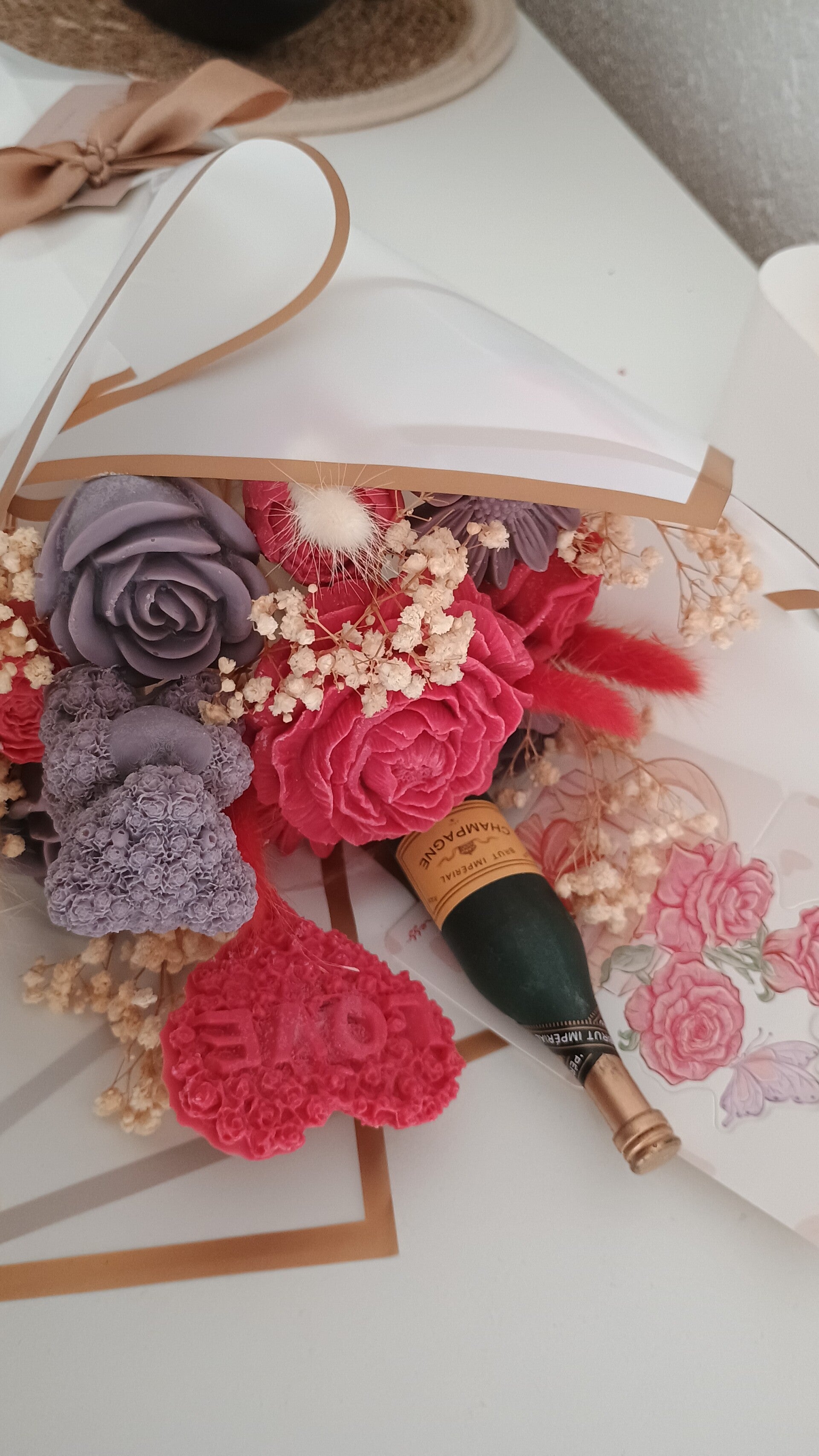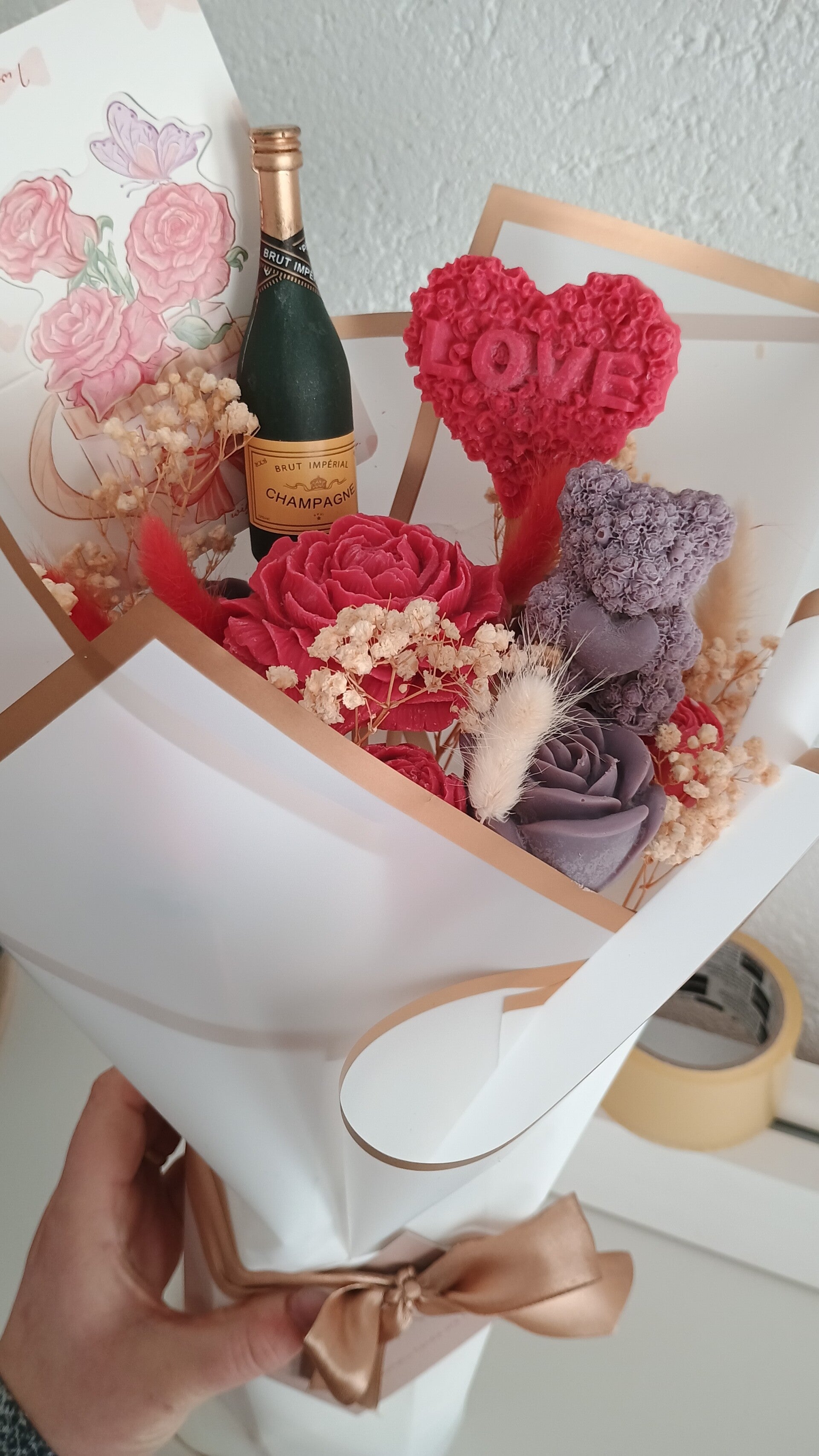 Die Sträuße enthalten ca. 7- 8 blütenförmige Kerzen mit einem wundervollen, natürlichen Blumenduft. Sie sind aus 100 % Sojawachs gefertigt.
